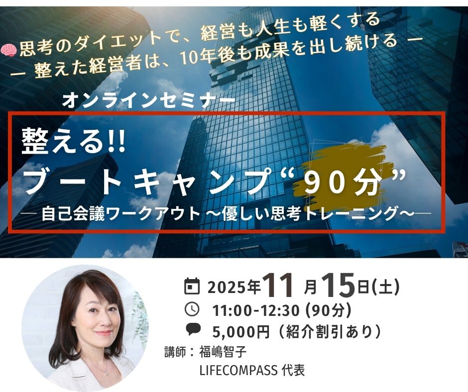| セミナータイトル | 整えるブートキャンプ90分 ─ “忙しい経営者”のための自己会議─ |